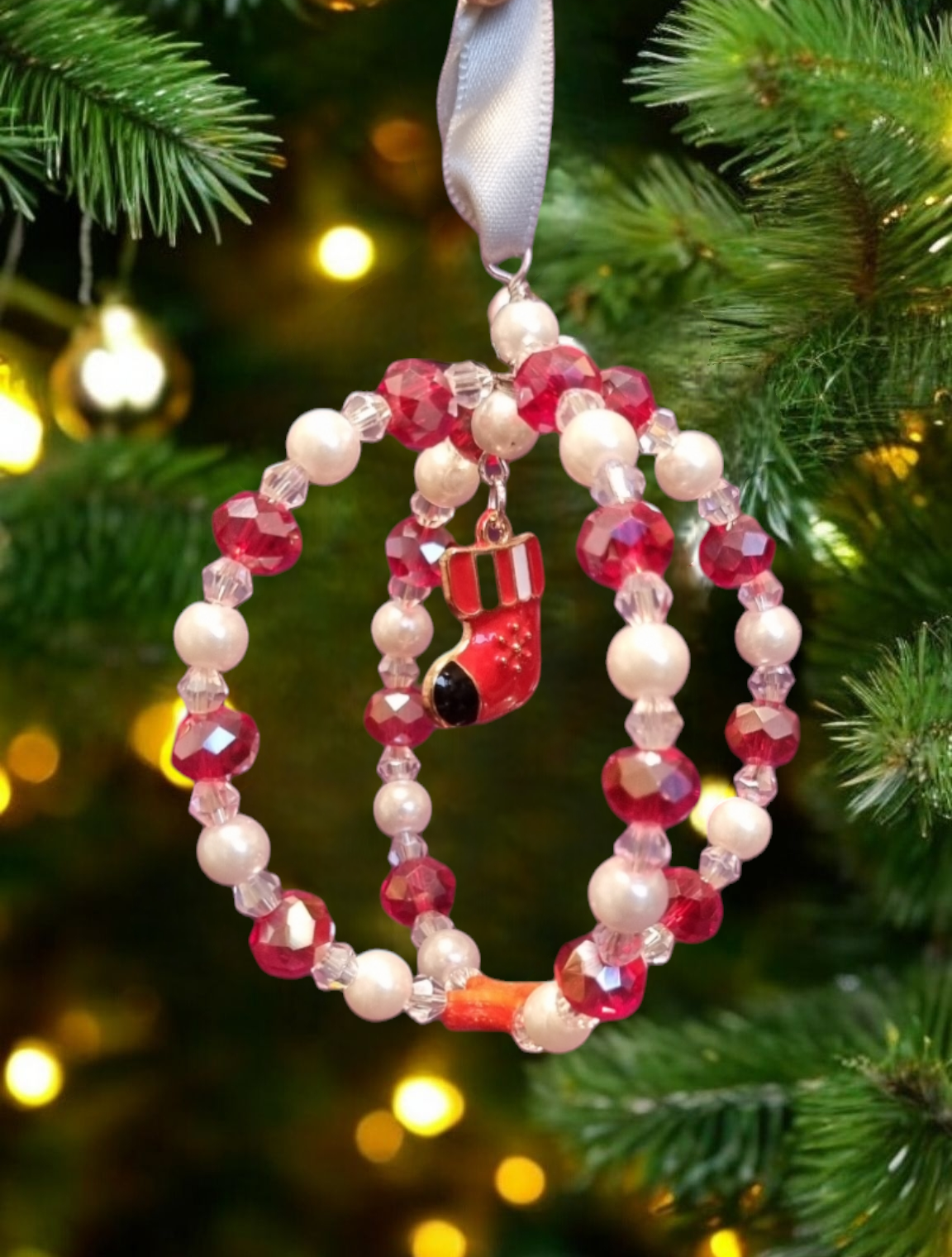 Sparkly handmade Christmas tree decoration, with stocking charm.