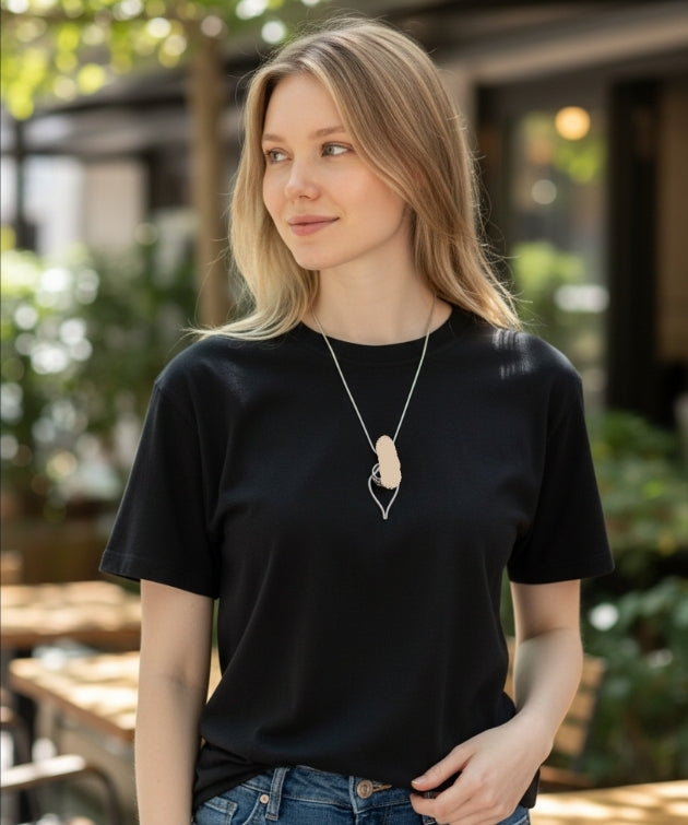 Effortlessly keep your ring close by with our handmade ring holder pendant. Simply slip the chain through your ring and securely wear it as a necklace. Never worry about losing your ring again.